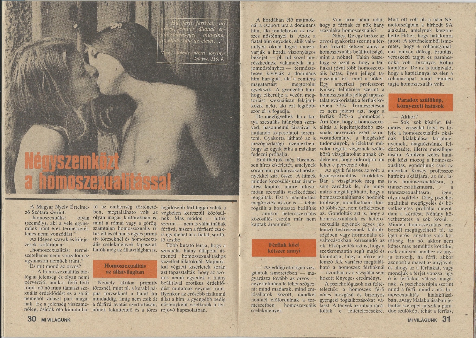 A nők azonos nemű vonzalmairól több népszerű és tudományos pszichiátriai-szexológiai írás is megjelent az államszocializmus ideje alatt. Ezekből megtudhatjuk, milyen ideálja volt a korszaknak szexualitásról, nemi szerepekről, családról és társadalomról. – A cikk Borgos Anna társadalomtudományi kutatómunkája alapján készült. Tudományos publikáció itt érhető el.