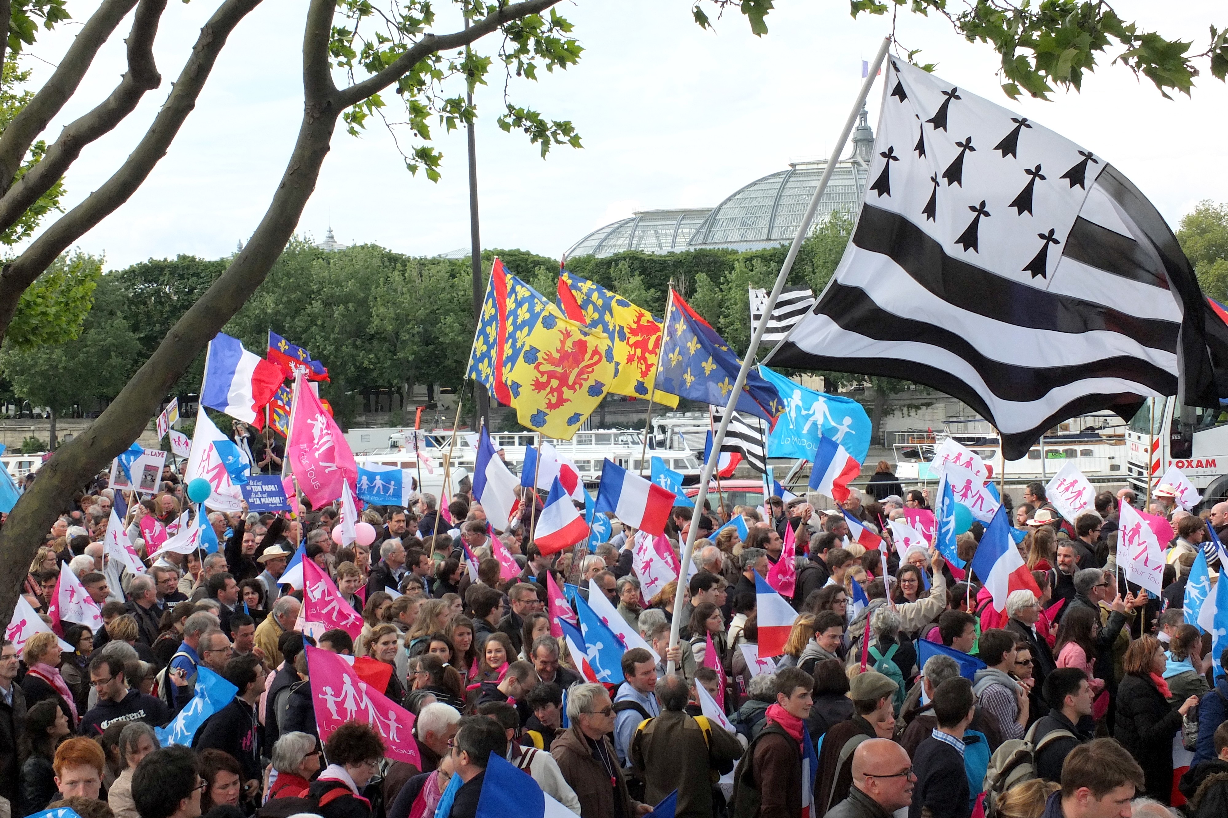 Frigide Barjot fiatalon a párizsi éjszakai élet ismert figurája volt, és (melegekkel barátkozó hetero nőként, „fag hag”-ként) melegbárokban lógott. Humorista lett, majd Lourdes-ban egy misztikus élmény hatására elkezdte komolyabban venni katolikus vallását. 2012-ben a korábban tanárként dolgozó Ludovine de La Rochère, valamint Albéric Dumont társaságában megalapította a Manif Pour Tous-t. A szervezet az azonos neműek házasságának engedélyezése (mariage pour tous) ellen lépett fel, 700 ezer aláírást gyűjtött, majd nagy (százezres) látogatottságú tüntetéseket szervezett több francia városban. (Egyes források szerint az egyik párizsi tüntetésükön egymillióan vettek részt.) A vidám tömegrendezvényeken a résztvevők a nemzeti lobogó mellett kék-rózsaszín, családpiktogramot ábrázoló zászlókat és transzparenseket lengettek.