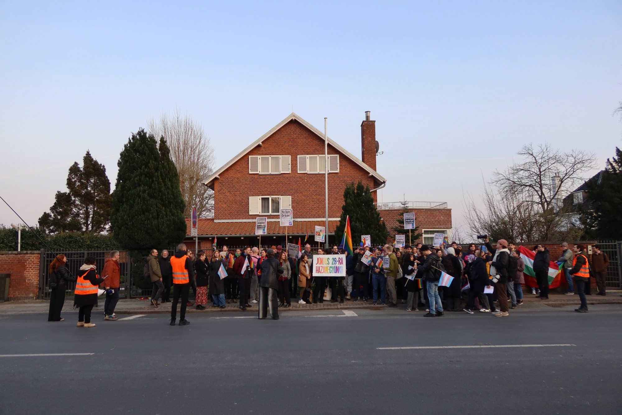 A Facebook esemény visszajelzései alapján körülbelül 300-an vettek részt a tüntetésen, az interneten közzétett képek alapján pedig a tömeg békés volt. A rendőrség ugyan kivonult a tüntetésre, azonban incidensekre nem került sor. A rengeteg szívárványos, transz és magyar zászló mellett egy molinó is látható volt amely szerint “június 28.-ra hazamegyünk,” amely azt sugallja, hogy a tömegben Dániában élő magyar bevándorlók is voltak.